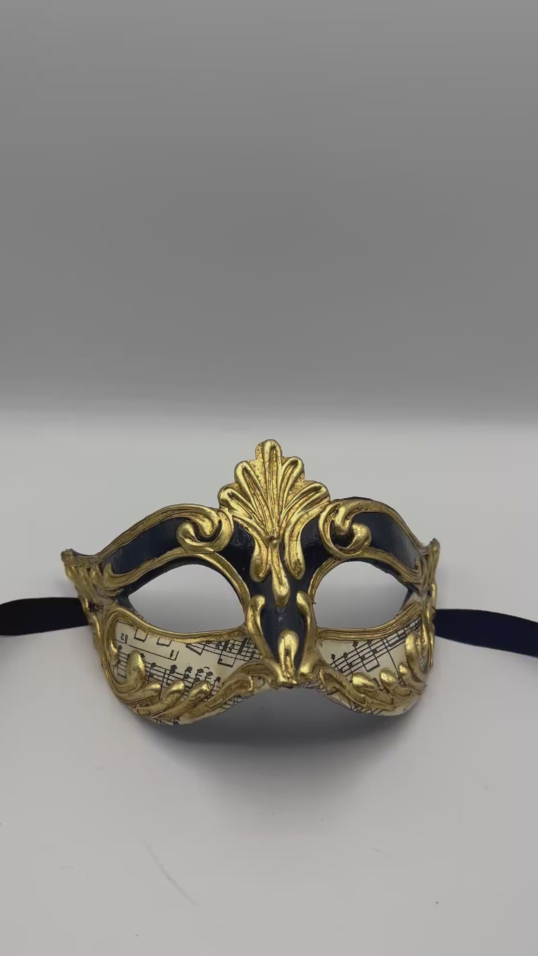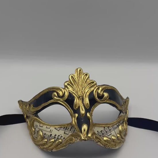 Handmade black Venetian mask, decorated with music notes and gold leaf that is suitable for a masked ball, masquerade or a Venetian carnival.