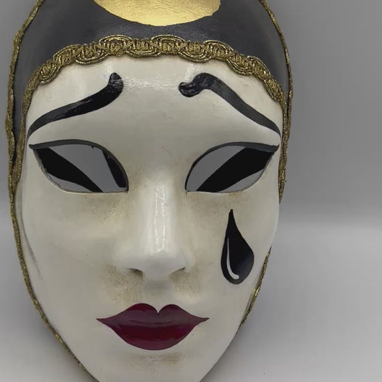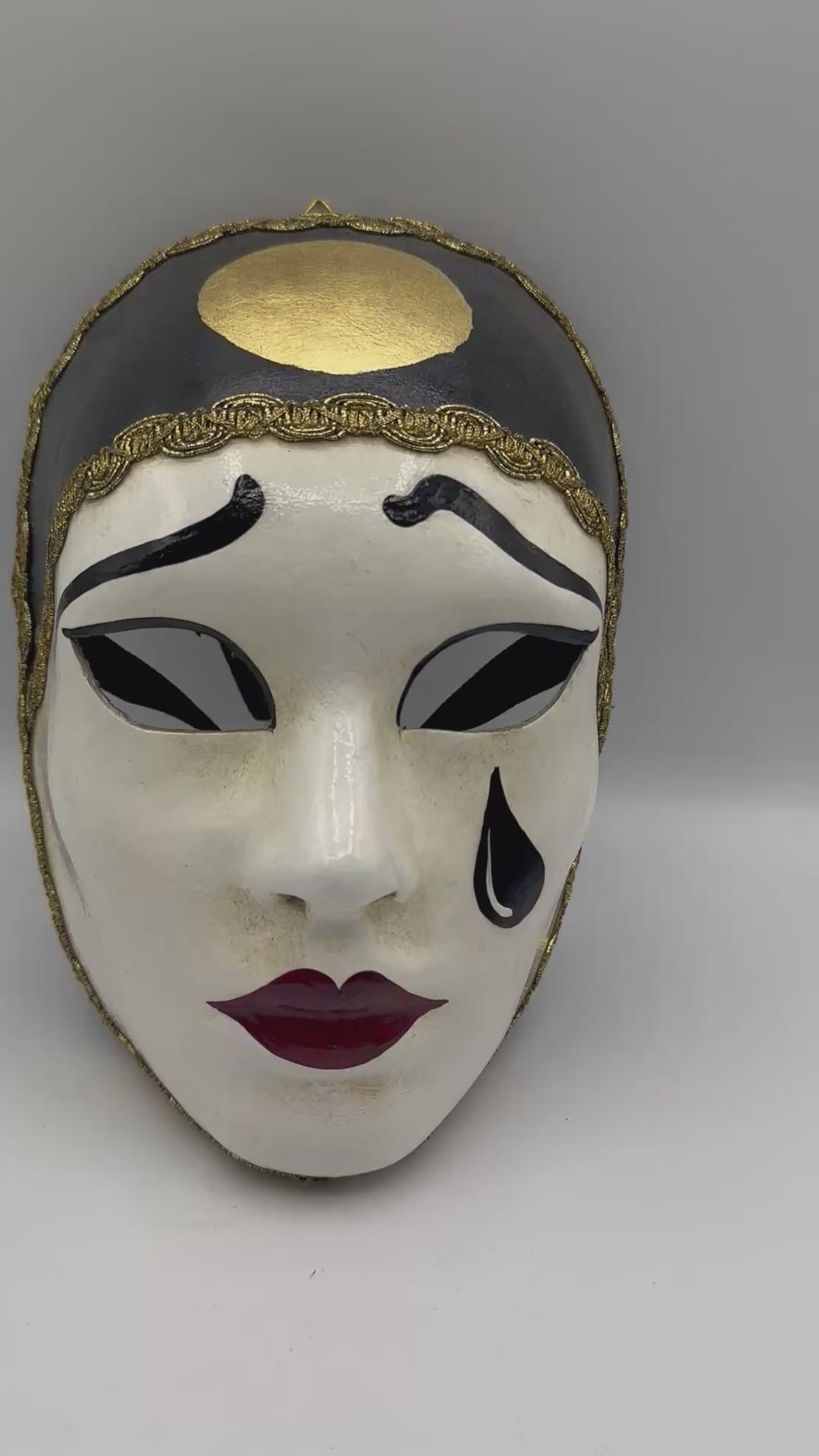 This Venetian costume mask from Pierrot is expressively painted.Pierrot is a pantomime player or character from ‘de Italian Commedia dell'arte’, a sad clown because Columbine has left him for Harlequin. His poetry and visual arts reflect his broken heart.The Pierrot-mask would not only be a gorgeous object in your house, but it also has two straps and can also be worn for events like costume parties, Venetian carnival, masked balls.