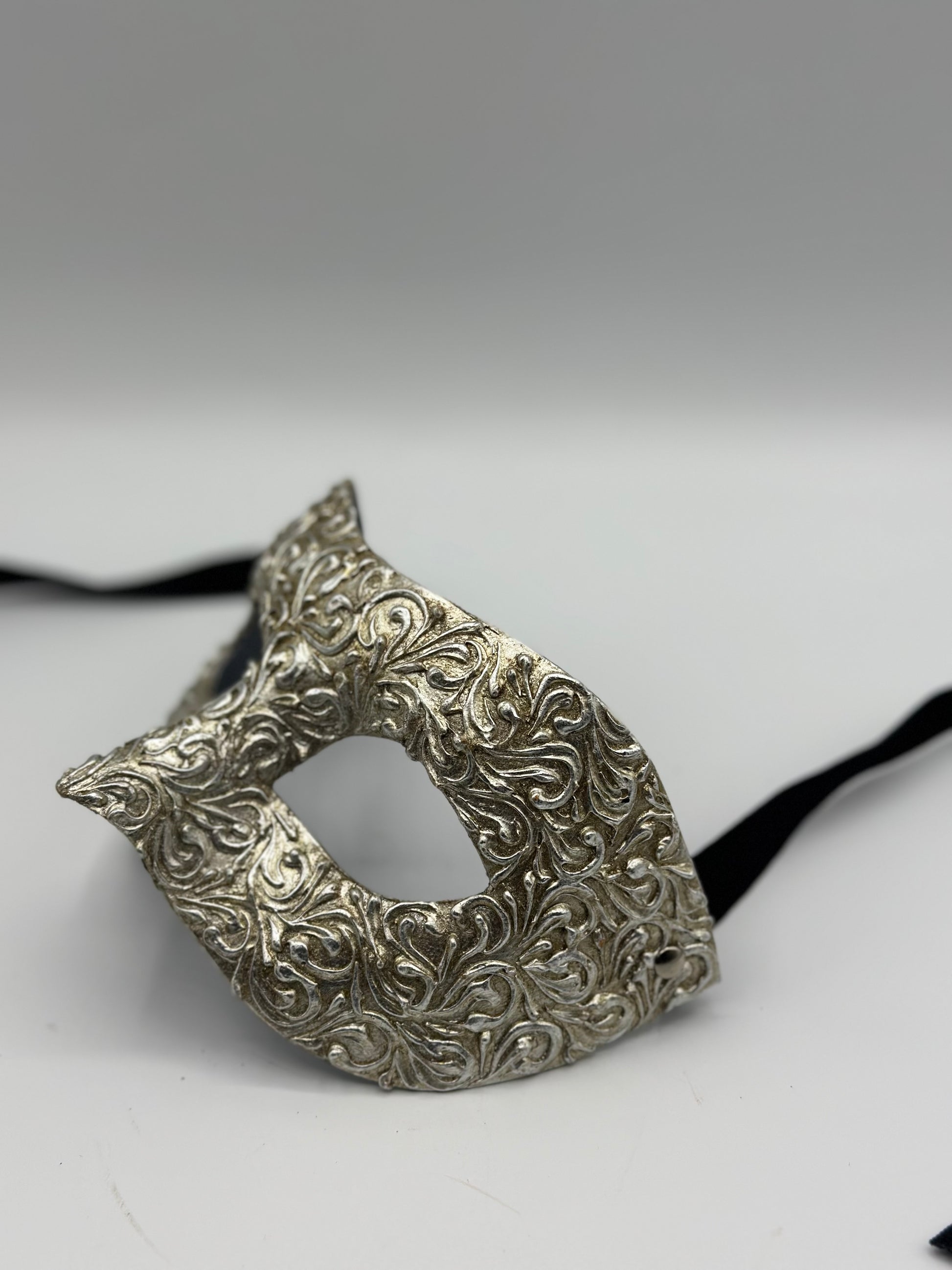Le masque de mascarade vénitien en papier mâché est décoré de peinture argentée.