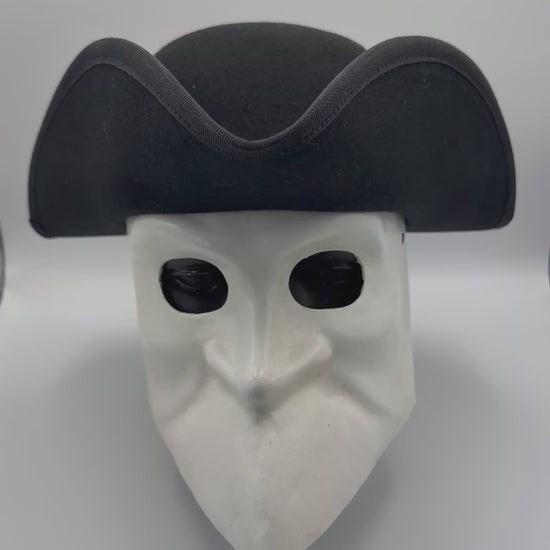 Cet ensemble comprend un masque vénitien Bauta blanc combiné à un tricorne traditionnel en laine Lana, créant un look vénitien authentique et élégant, souvent associé à Casanova et à l'aristocratie vénitienne.