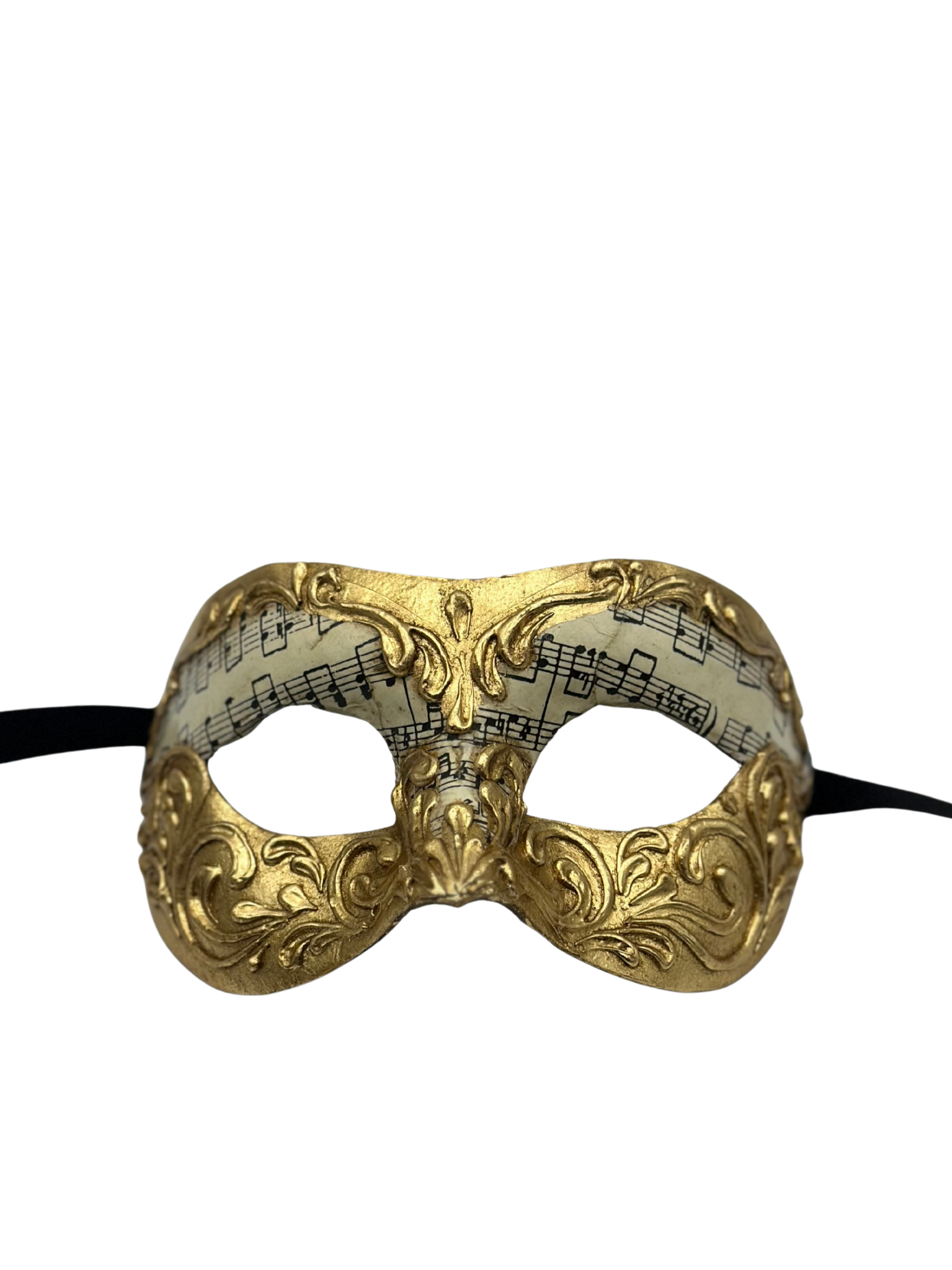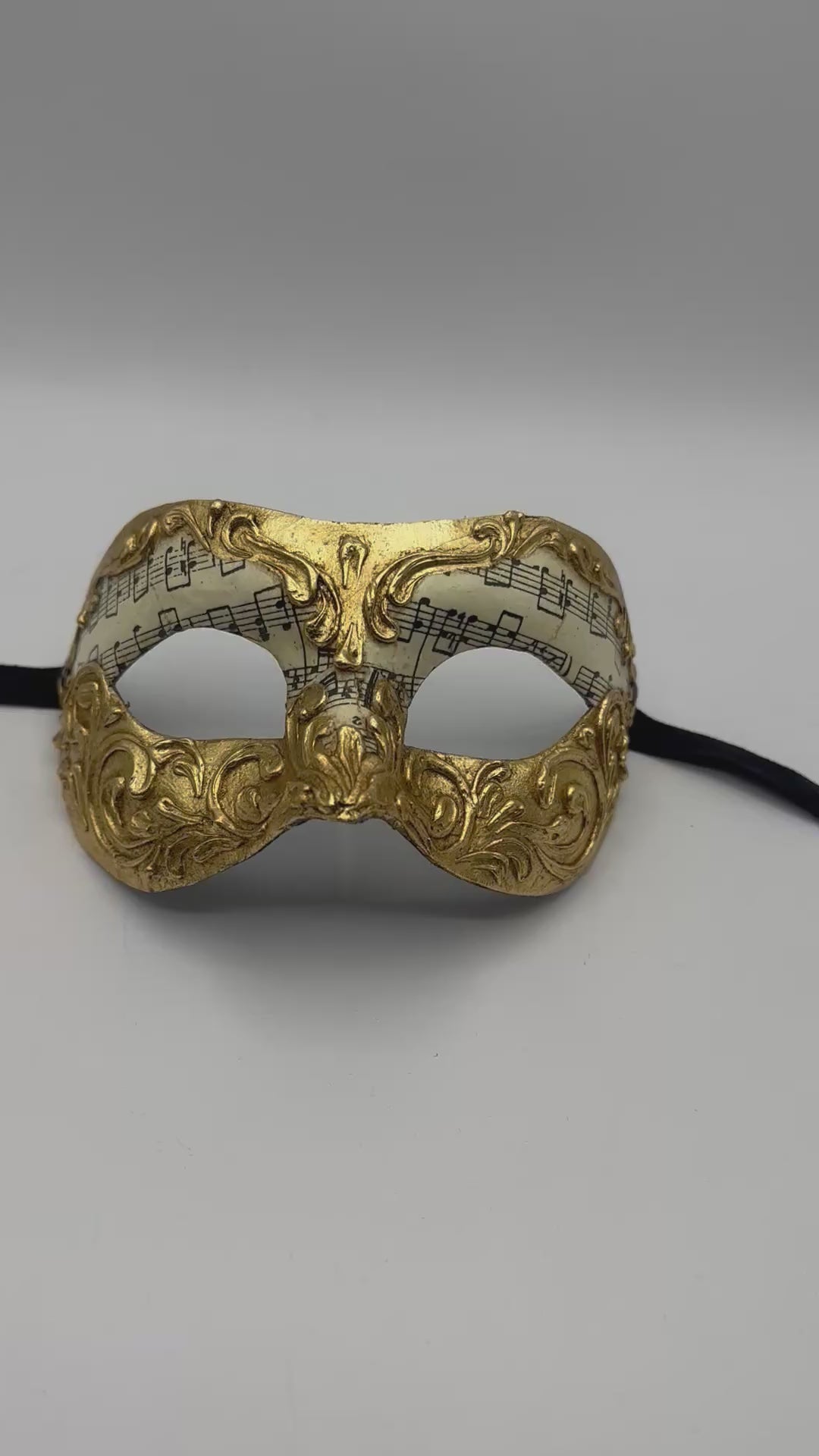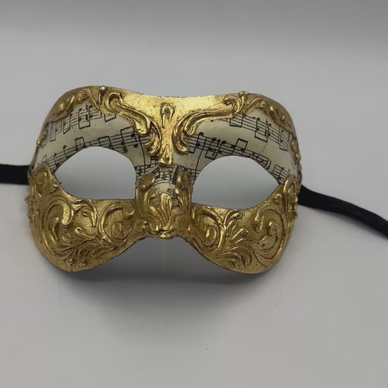Ce masque vénitien raffiné allie l'élégance de l'art baroque à la magie de la musique. Fabriqué à la main en papier mâché, il est orné de détails ornementaux dorés entourant une subtile partition musicale.