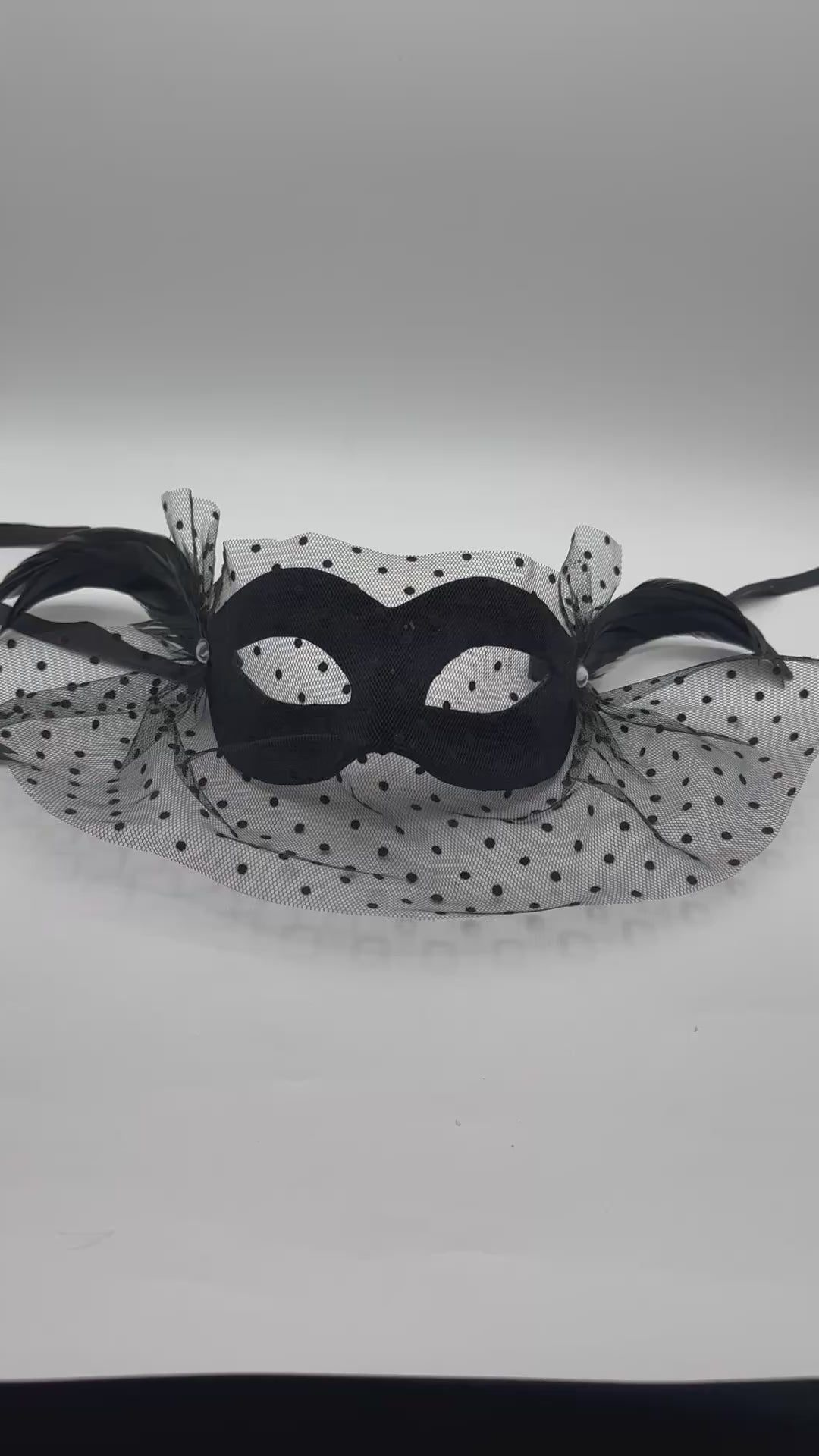 Hier zie je ons bal masker van zwart fluweel met een voile die is vastgezet met gouden rozetjes met een diamantje, waaruit heel subtiel zwarte veertjes waaieren.
