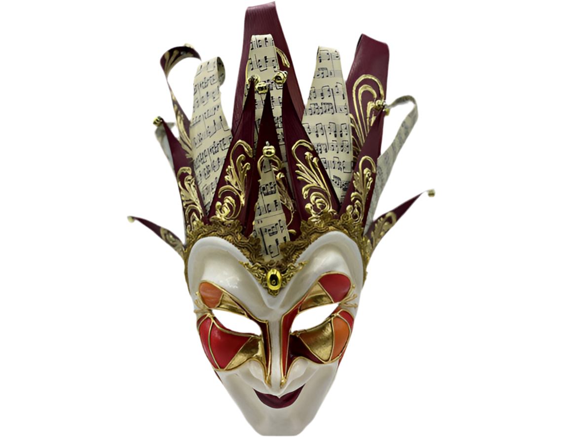 Máscaras venecianas hechas a mano en la propia Venecia. Están decoradas con pintura roja, naranja y dorada y un pasamaneria galon dorado. Esta máscaras veneciana tiene pintada en sus puntas notas musicales y también campanas doradas.